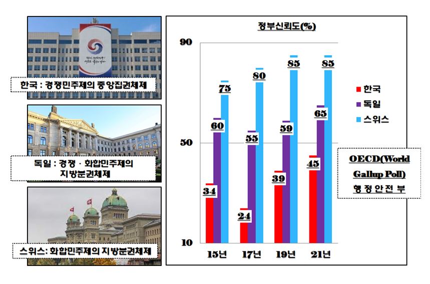 그런데 우리나라의 현 정치·행정기관은 국민 불신의 대상이 되어 있다고 해도 과언이 아니다. 2023년 지난 해, 우리나라 정치·행정기관 대부분의 신뢰도는 세계국가들 중 하위 수준에 머물고 있다(한국경제연구원 2023년 3월9일 보도자료)- 이는 '2023년 레가툼(Legatum) 번영지수'를 분석하여 발표한 것이다.