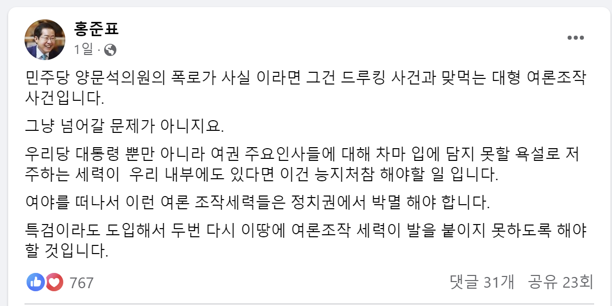 국민의힘의 전신인 한나라당 대표 출신 홍준표 대구시장은 지난 16일 자신의 페이스북에 "그냥 넘어갈 문제가 아니다. 이건 능지처참 해야 할 일"이라고 강한 비판을 남겼다. 그는 "여야를 떠나 이런 여론 조작세력들은 정치권에서 박멸해야 한다"며 "특검이라도 도입해서 두번 다시 이 땅에 여론조작 세력이 발을 붙이지 못하도록 해야 할 것"이라고 주장했다.