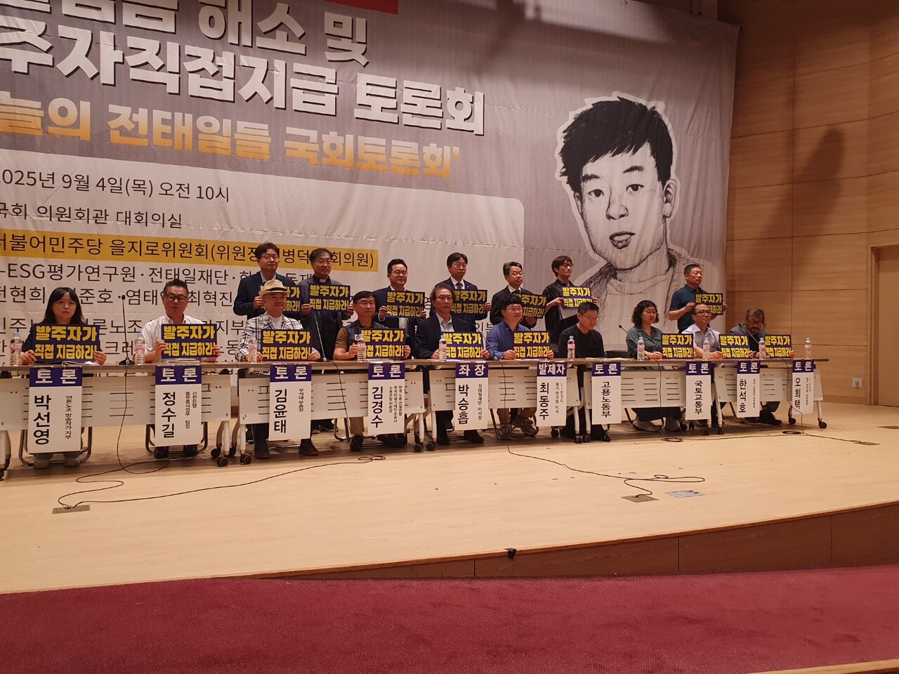 좌장을 맡은 박승흡 전태일재단 이사장은 "체불임금과 산업재해의 만연은 사회적 재난이고 참사"라며 "불법 하도급 체계를 근본적으로 혁파해야 하지만 무엇보다 우선 체불임금을 막는 확실한 대안인 발주자 직접지급제를 전면 도입해야 한다"고 말했다.